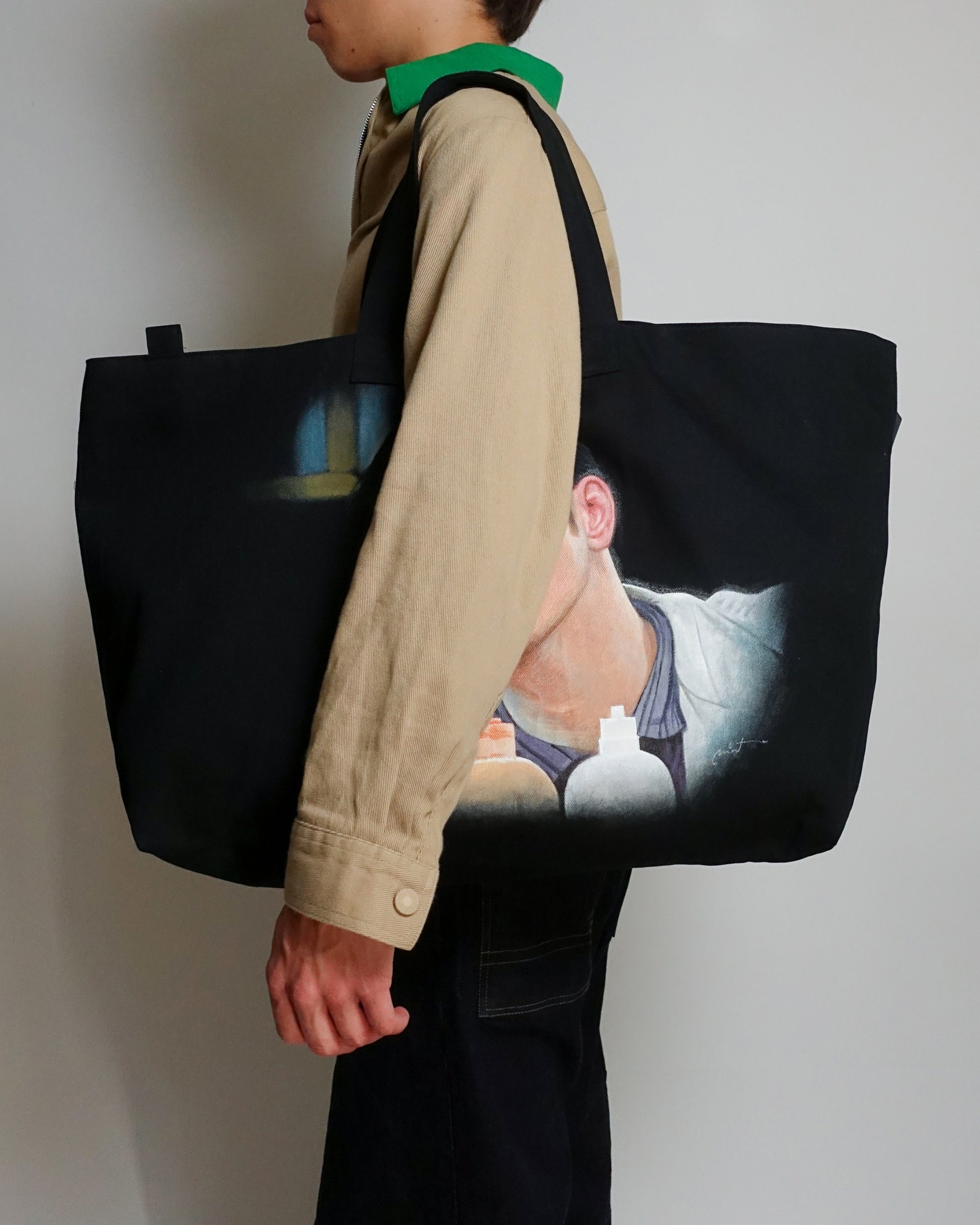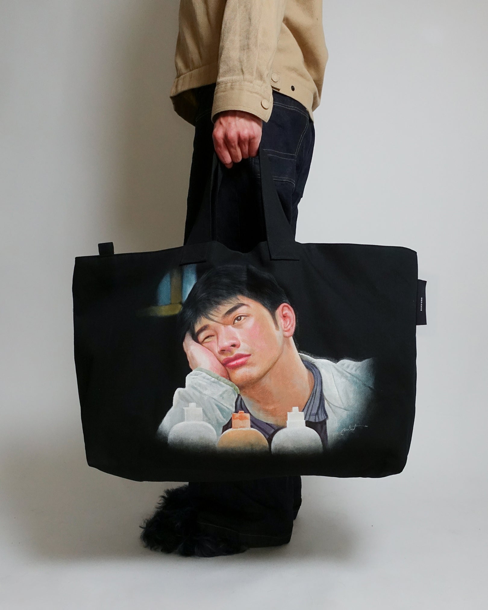 A sample capsule of three hand-painted canvas bags inspired by quiet male characters. Each portrait is executed by Thai movie-poster painters using acrylic-on-canvas techniques, later transferred and fixed on heavyweight cotton jeans painted in Chiang Mai assembled in Bangkok, Made in Thailand.